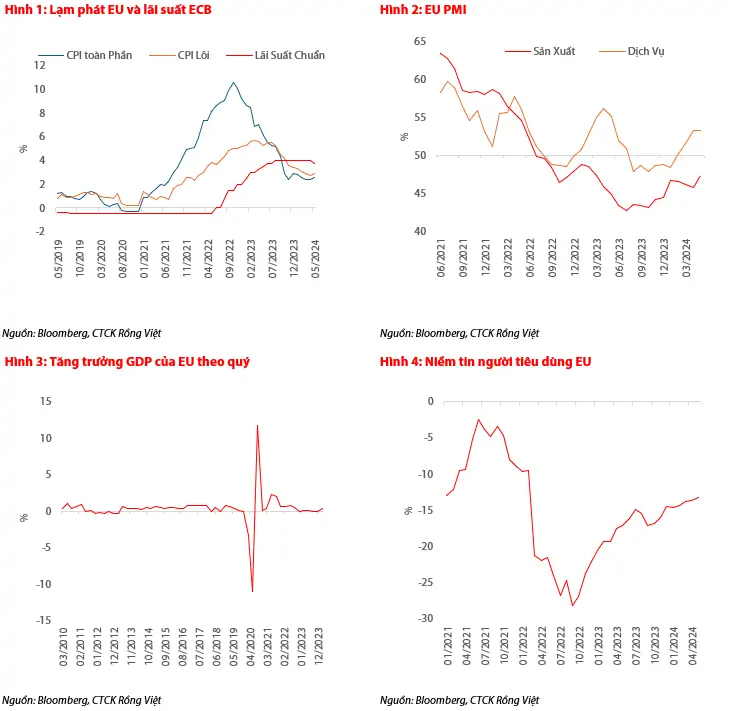 Bối cảnh kinh tế hiện tại hỗ trợ cho hành động cắt giảm lãi suất của ECB. Cụ thể, lạm phát tại khu vực Eurozone đã giảm đáng kể từ mức 10.6% vào tháng 10/2022 xuống còn 2.6% vào tháng 5/2024, cho thấy lạm phát đang đi đúng hướng. Hơn nữa, các dữ liệu mới nhất từ khu vực đồng Euro cho thấy tâm lý của người tiêu dùng và doanh nghiệp đã được cải thiện. Tốc độ suy giảm trong ngành sản xuất PMI đã giảm nhiều nhất trong hơn một năm kể từ tháng 3 năm 2023, cho thấy sự phục hồi của hoạt động kinh doanh ở EU (xem Hình 2). Ngoài ra, niềm tin của người tiêu dùng vào EU cũng đã được cải thiện từ mức thấp kỷ lục -28.2 vào tháng 9 năm 2022 lên -13.2 vào tháng 5 năm 2024 (xem Hình 4). Với diễn biến lạc quan này, ECB đã điều chỉnh dự báo tăng trưởng GDP năm 2024 lên 0.9% vào tháng 6 từ mức 0.6% vào tháng 3.